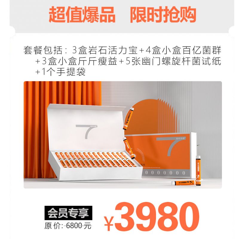 3盒岩石活力宝+4盒小盒百亿益生菌+3盒小盒斤斤瘦益+5张幽门螺旋杆菌试纸+1个手提袋