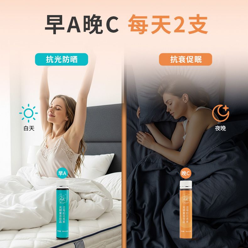 产品特点:早A喝蓝色,晚C 喝橙色 1天2支 日夜修护